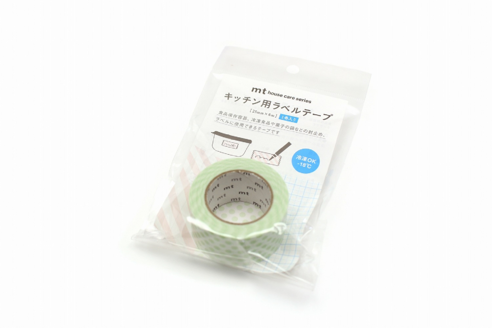 キッチン用ラベルテープ 食品保存容器、冷凍食品や菓子の袋などの封止め、ラベルに使用できるテープです。 ◎特徴 ・手でまっすぐに切れます。 ・貼って剥がせるテープです。 ・油性ペンで字がかけます。 ・冷凍庫(-18℃)でも使用できます。 ◎用途 ・食品保存容器などの内容物や賞味期限などの表示用。 ・冷凍食品や菓子の袋の密封、仮止め用。 ・ゴミ袋などの補強用。 ◎使用上の注意 ・直射日光、高温多湿の場所は避けてください。 ・テープを貼る部分のホコリ、汚れ、油分、水分をよく拭き取ってから貼り付けてください。 ・電気絶縁用、梱包には使用しないでください。 ・テープを貼ったままオーブンや電子レンジでは使用しないでください。 ・貼る材質によっては糊が残ったり、損傷が生じる場合があります。 ・皮膚に貼らないでください。 ・お子様の手の届かない場所で使用、保管してください。 ・用途以外の目的に使用しないでください。