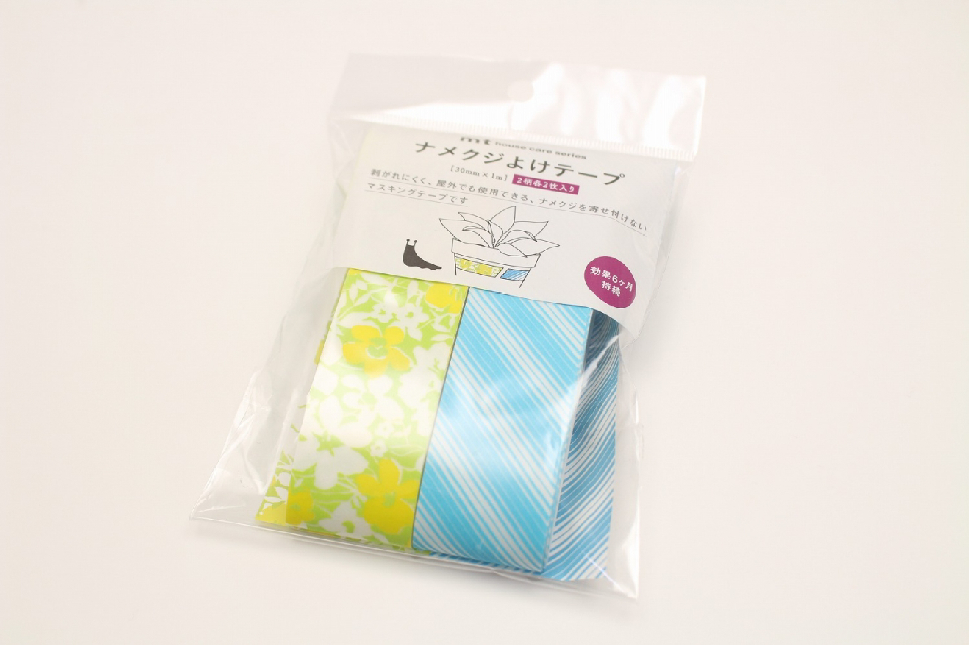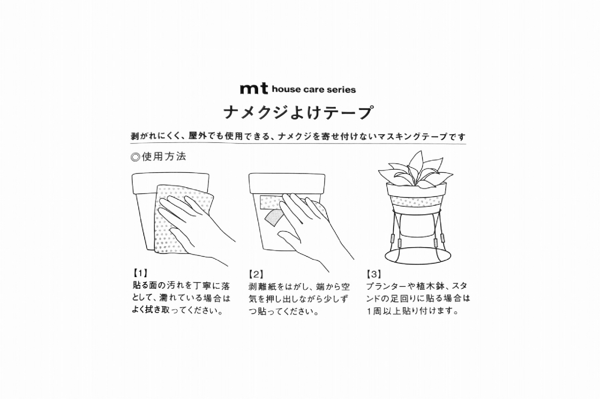 はがれにくく、屋外でも使用できる、ナメクジを寄せ付けないマスキングテープです。 ◎使用方法 1.貼る表面の汚れを丁寧に落として、濡れている場合はよく拭き取ってください。 2.剥離紙を剥がし、端から空気を押し出しながら少しずつ貼ってください。 3.プランターや植木鉢、スタンドの足回りに貼る場合は一周以上貼り付けます。 ◎使用上の注意 ・本来の用途以外には使用しないでください。 ・本製品は食べられません。誤って口に入れた場合は水ですすぎ、医師に相談してください。 ・本製品を剥がす際に、のりや跡が残ることがあります。残って困る部分には貼らないでください。 ・はがす際はゆっくりはがしてください。 ・凹凸が激しい面に貼った場合は、はがれる場合があります。 ・本製品は忌避するものですので、なめくじの個体差により効果が出にくい場合があります。 ・直射日光や高温となる場所を避け、お子様のての届かないところに保管してください。